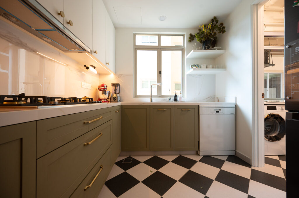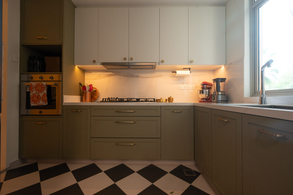 One of my favourite spaces in this home is the kitchen. Designed in a soft sage green with brass accents, it brings an earthy sophistication to the space. The bold black-and-white checkered flooring adds a touch of vintage charm, reminiscent of old-world European kitchens, yet grounded in modern practicality. It’s both functional and expressive—a space that effortlessly becomes the heart of the home.