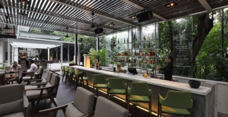 Selection of Plants and Materials: Tropical plants and durable materials suit Singapore’s climate.